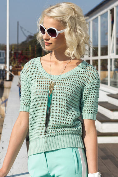 Красивый джемпер модного мятного цвета. Модель с короткими рукавами и круглой горловиной. Сзади декорирован планкой с крупными пуговицами.